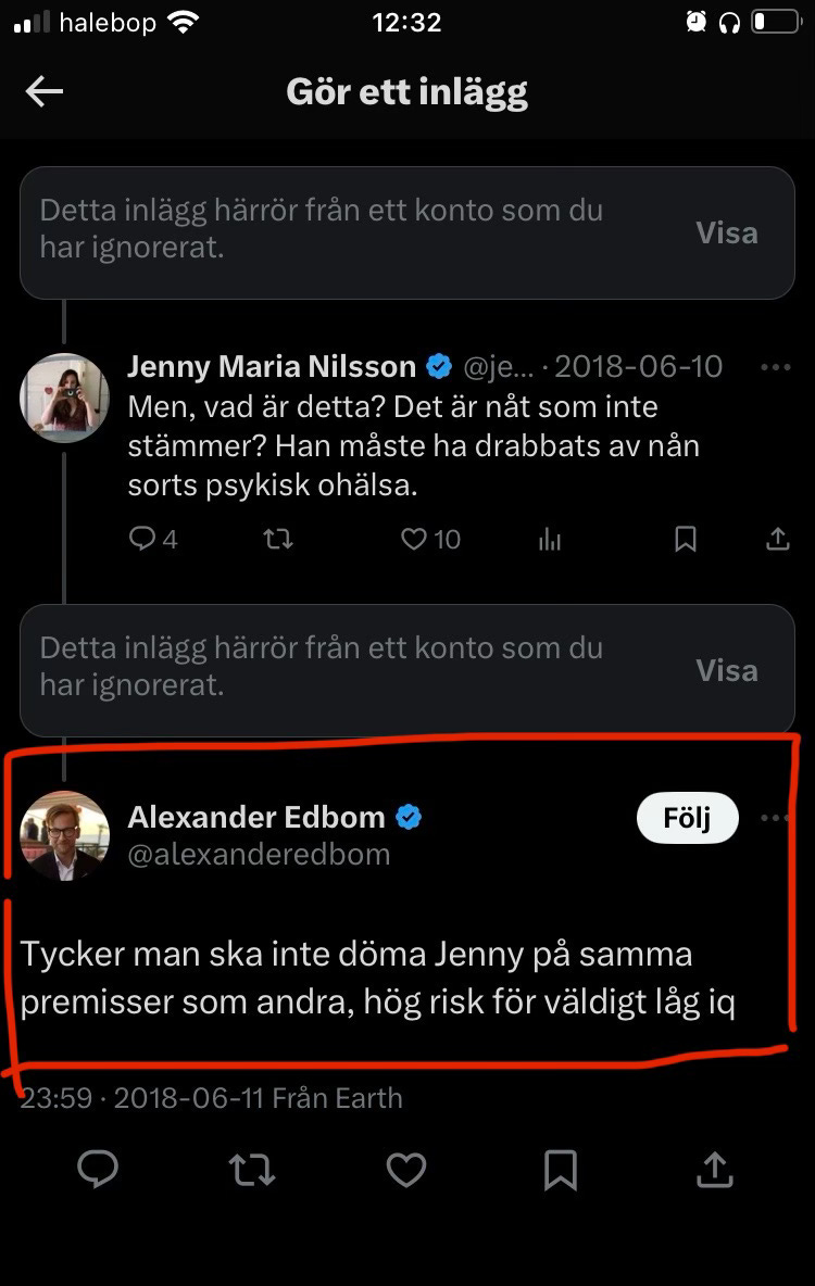 I alla år på X, forna Twitter, dök Edbom då och då upp i mina trådar och skrev något förolämpande – som ni ser på skärmdumpen, den enda jag har sparat. Alltid variationer på samma tema: retarderad, låg IQ, dum, höhöhö.
