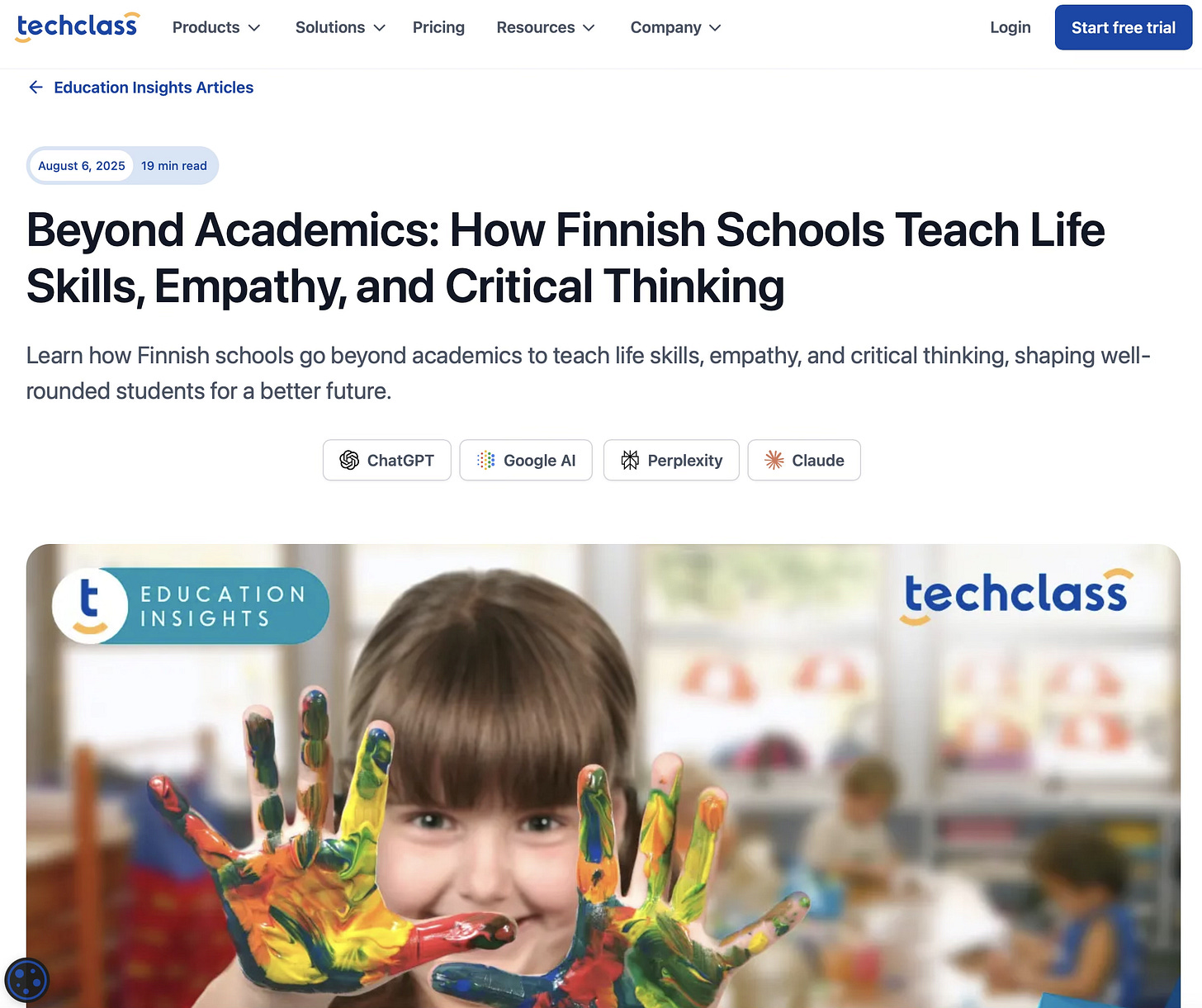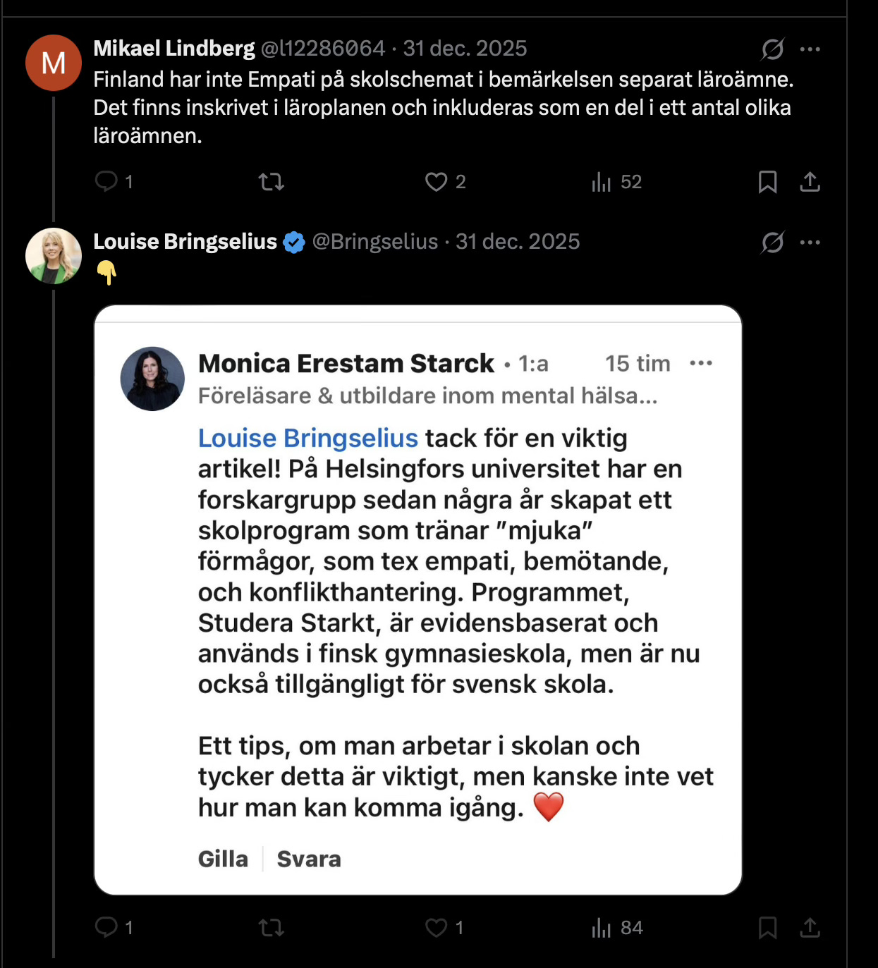 När jag skrev till Bringselius på X om detta – att det inte stämmer (jag var inte otrevlig) blockade hon mig. På förfrågan från andra, mestadels lärare, om källan till ”empati på schemat” svarade Bringselius med en länk till en AI-genererad hemsida som gör inspirerande reklam för ett EdTech-företag – men den sidan har förstås inget med Finlands faktiska skolväsende att göra.